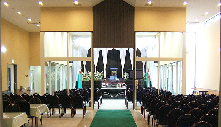 | クリスタルホール | 200名まで収容できる大型ホールです。また、ガラスルームが設置されており、ご遺族とご会葬者がそれぞれの立場で故人とのお別れができるようにもなっています。 |